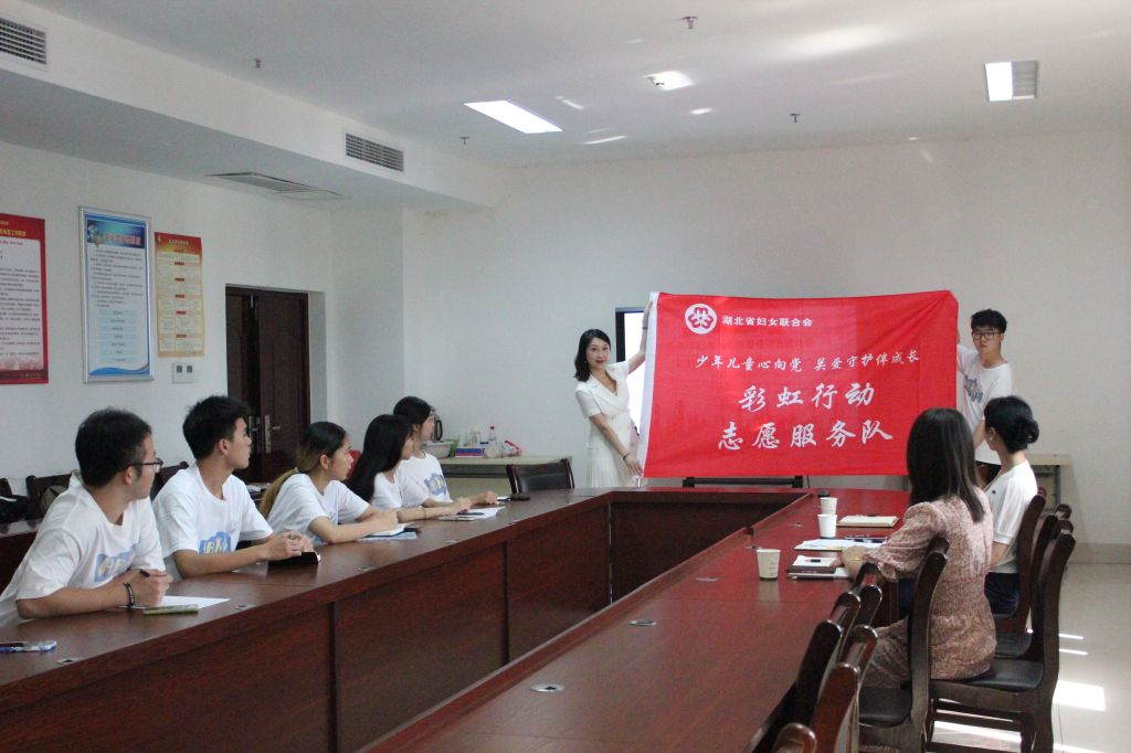 魏燕为志愿服务队进行授旗并讲话,她对团队的前期工作给予充分肯定,认为活动设计有内容、有形式、有特色、有亮点,还对湖北省关爱留守流动儿童“彩虹行动”志愿服务活动做基本介绍,同时提醒队员们在活动中关心关爱留守儿童,给孩子们带去一个温暖的假期生活。