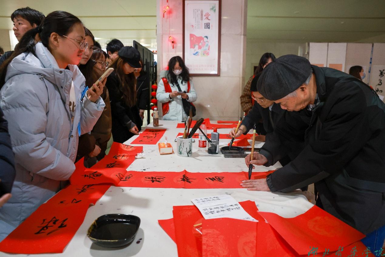 此次嘉年华活动中,除了由各学院社团和离退休老教师奉上的合唱、歌舞、电吹管、葫芦丝、口琴等多姿多彩的节目“大餐”外,beat365官网还将活动现场打造成了一条充满传统文化与现代趣味的文化街区。现场共开设了25个摊位,剪纸、烙画、漆扇、投壶等非遗互动展示,康复理疗、推拿、耳穴等康复项目体验,武当中草药水晶标本、腊叶标本等自然科普展示,蛋糕、糖葫芦、襄阳牛肉面等丰富美食品尝,点歌、彩绘、心理游戏等趣味解压体验,猜灯谜、对唐诗、编织中国结等年味退休教职工现场书写春联送春联……师生们手持“集福卡”专属明信片在各个摊位参与体验,集福签盖印章。