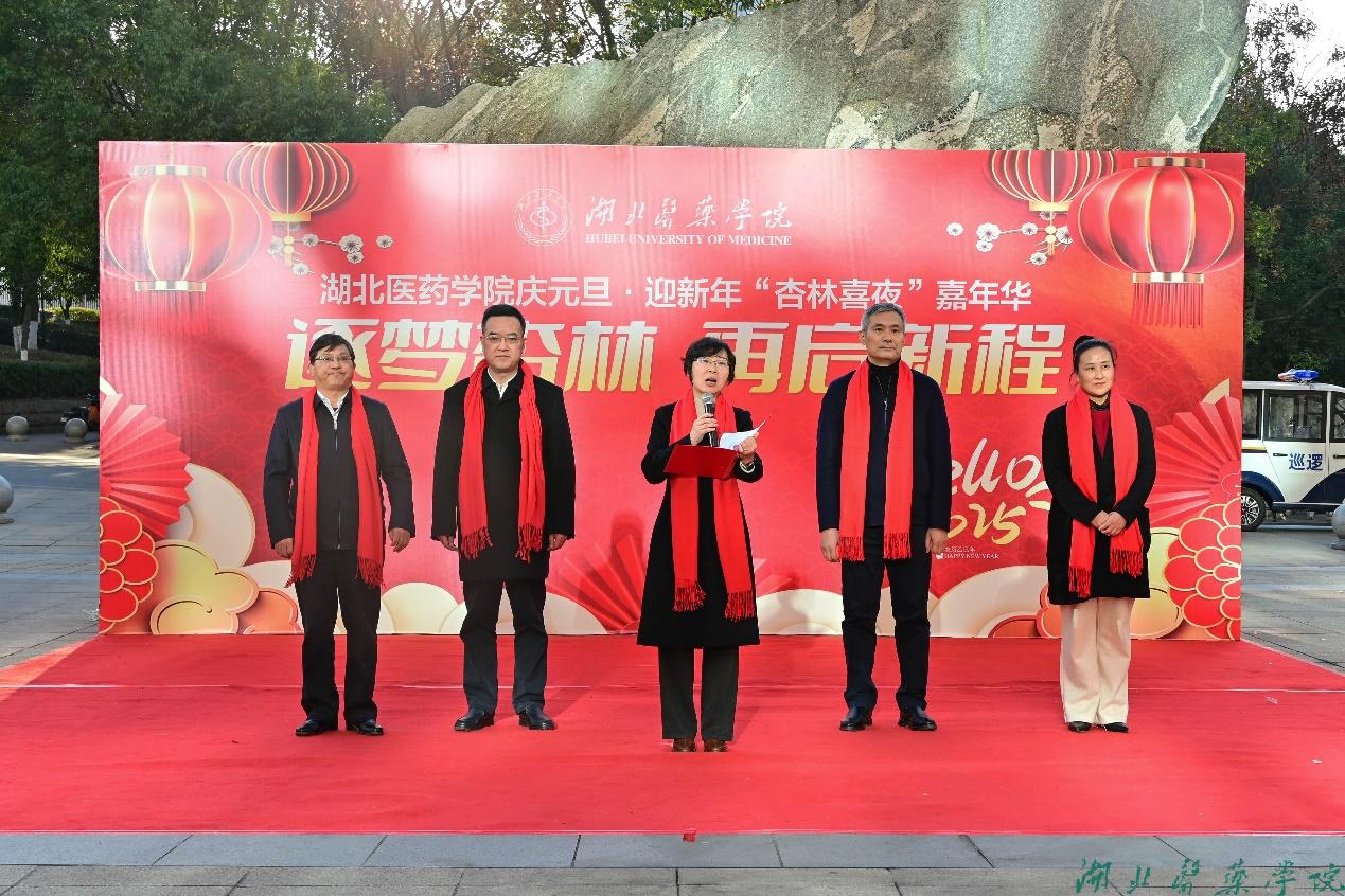 民乐合奏《金蛇狂舞》、独唱《好运来》、舞蹈《迎春》等节目拉开了本次嘉年华活动的帷幕。开幕式上,beat365官网党委书记郑丹凤发表新年献词,表示“2025年,是beat365官网建校60周年,我们将以‘甲子一梦,圆梦今朝’的志气与干劲,深化质量立校、人才强校、特色兴校,深化内涵建设、条件建设和队伍建设,续写高质量发展新篇章,再创新辉煌。”校领导徐荣、张海蛟、谭艳也分别送上新年祝词,共同祝愿全校师生新年快乐。党委副书记、校长罗杰宣布beat365官网庆元旦·迎新年“杏林喜夜”嘉年华活动开幕。