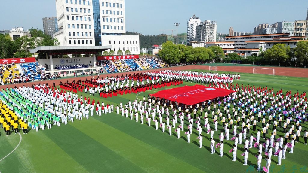 大型表演《六秩春华育桃李服务支点建新功》为现场师生带来了一场精彩的视听盛宴,将现场氛围推向高潮。表演第一篇章为杏林芳华。其中,太极扇表演《象王行》中,130名学生手持红扇,以刚劲有力的武术动作配合着激昂的鼓点,整齐划一地展现出武术的阳刚之美;伞舞《破阵乐》则以优美的舞姿和灵动的伞花变化,将力量与柔美完美融合;街舞《哪吒》以充满活力的动作和富有感染力的音乐燃爆全场;第二篇章甲子弦歌中,朗诵与歌舞结合,回顾了学校六十年来的风雨历程。巨幅校旗在队伍上方惊艳亮相,表演者摆出“60”数字,表达对学校建校60周年的热爱与祝福。第三篇章赤子丹心中,汉族、藏族、土家族等多民族学生演唱歌曲《我的家》,唱响民族团结赞歌。
