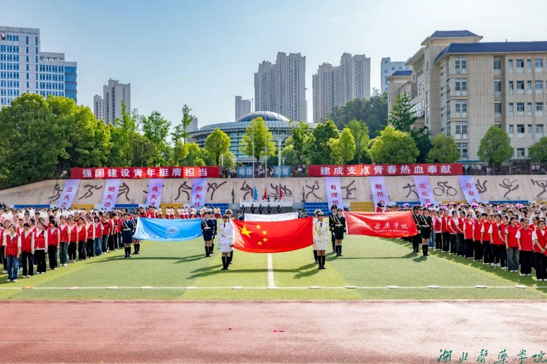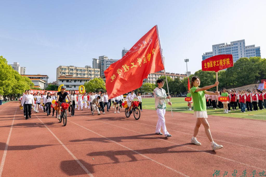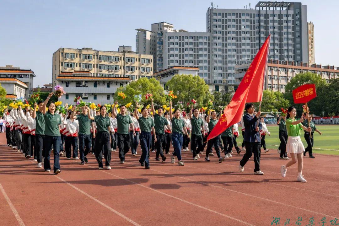 早上8点30分,伴随着激昂的音乐,国旗护卫队、裁判员、志愿者和二级学院运动员代表方阵精神抖擞依次入场。他们身着各具特色的服装,手拿捧花、风车,别具匠心的创意与铿锵有力的口号交相辉映,充分展现了湖医药师生昂扬向上的精神风貌。