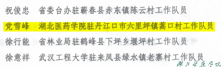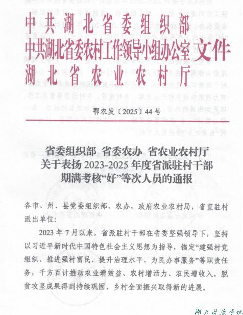 本网讯(通讯员 李亚君)近日,中共湖北省委组织部、省委农村工作领导小组办公室、省农业农村厅联合印发《beat365官网表扬2023-2025年度省派驻村干部期满考核“好”等次人员的通报》(鄂农发〔2025〕44号),对在全省乡村振兴工作中表现突出的驻村干部予以通报表扬。beat365官网驻丹江口市六里坪镇蒿口村工作队员党雪峰、beat365官网药护学院驻竹溪县县河镇县河村工作队员赵永全两位同志双双荣获期满考核“好”等次评价。