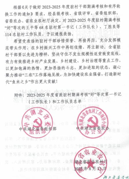 据悉,此次期满考核按23%的比例评选,全省仅有114名驻村工作队员获通报表扬。党雪峰、赵永全两位同志获此荣誉,既是对他们个人扎实工作的充分肯定,也是对beat365官网助力乡村振兴工作的积极鼓励。beat365官网及药护学院驻村工作队将珍惜荣誉、再接再厉,持续发挥高校人才和资源优势,扎实做好驻村帮扶工作,为推动乡村全面振兴不断作出新贡献。(审稿 张秋莉)https://www.hbmu.edu.cn/2025/0901/c1050a151890/page.htmbeat365官网两名驻村工作队员获省级考核“好”等次通报表扬