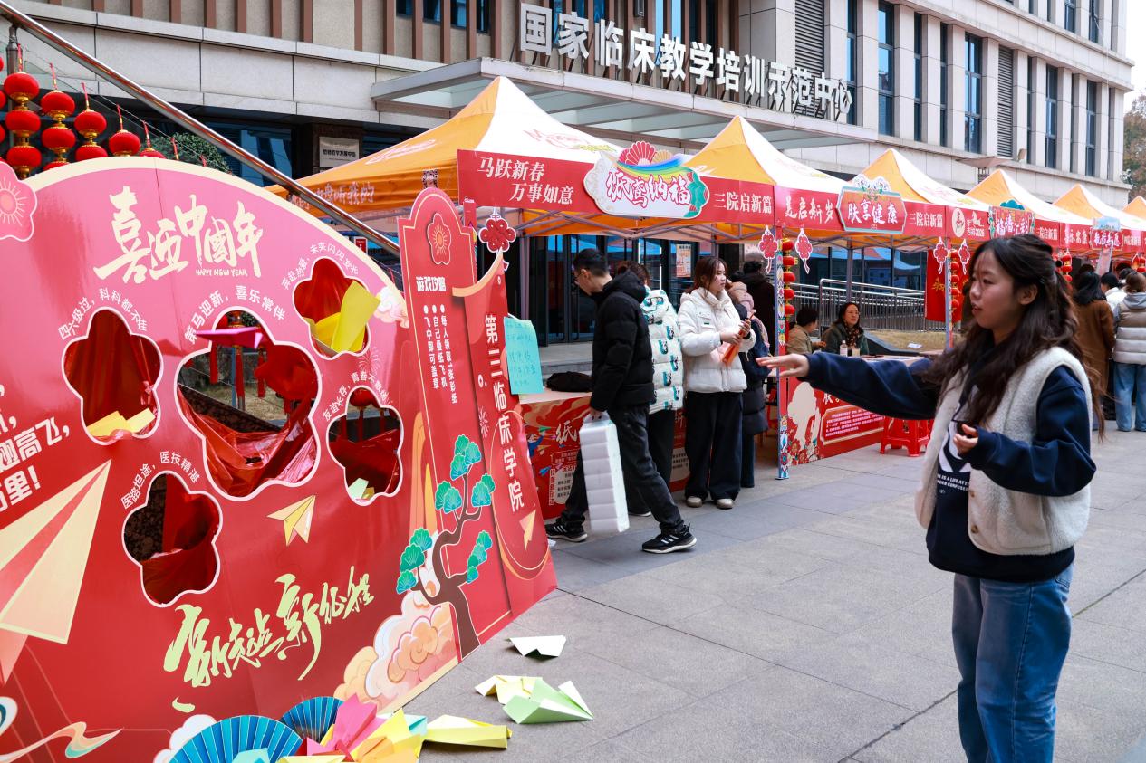 现场共设置了60余个特色摊位,涵盖传统文化体验、趣味互动游戏和专业特色服务等。师生们既能亲身体验剪纸、拓印、漆扇制作等非遗项目,还能参与投壶、夹福球、骰子问答等趣味互动游戏,感受中华优秀传统文化的独特魅力。活动现场同时提供康养咨询、康复理疗、岭南飞针等专业特色服务,让参与者在互动中增进对医学文化的理解。师生们在各摊位前来回穿梭,沉浸式体验各项活动,并可领取定制书签、日化用品、就餐券等纪念礼品。