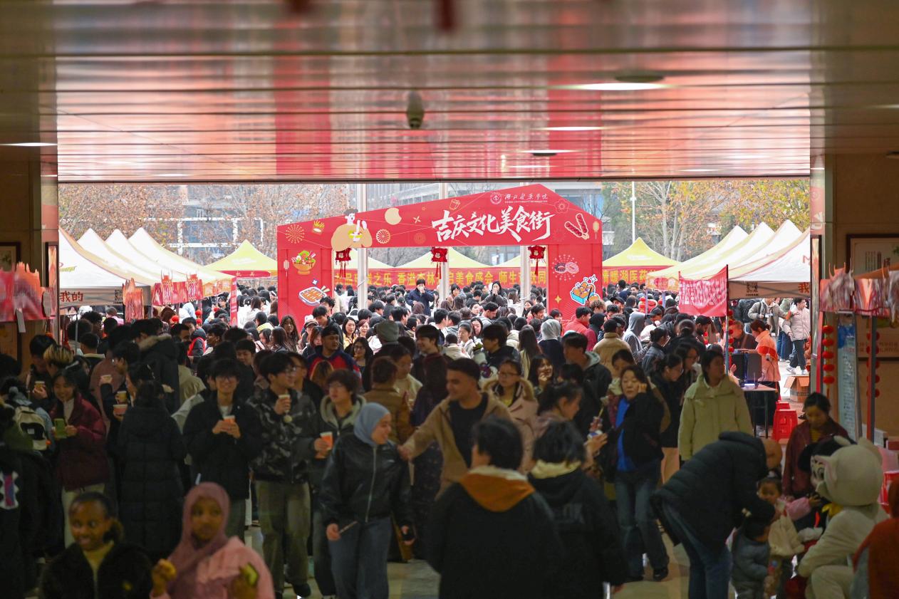 美食街区更加人气旺盛。学校各餐厅为师生们准备了水果榨汁、炸薯条、臭豆腐、炸年糕等热食,还有山楂丸、棉花糖、冰糖葫芦等冬日特色小吃,吸引众多师生驻足品尝。在民族团结摊位,师生们不仅能品尝酥油茶、青藏风味酸奶、青稞酒、牛肉干等特色食品,还可亲自动手体验制作糌粑。参加活动的师生直呼“既吃得过瘾,也玩得尽兴”。